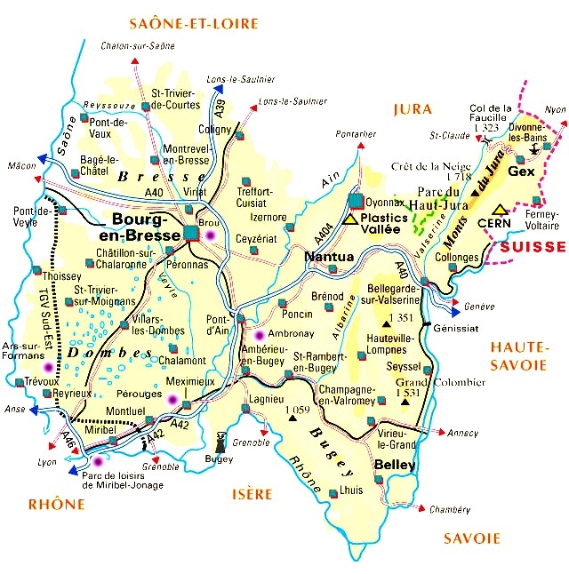 Le département : La rivière homonyme traverse le département du nord au sud. On peut donc dire que la partie ouest est un pays de plaines (Bresse, plaine de l'Ain, Val de Saône) ou de bas plateau (Dombes), à l'exception du Revermont qui annonce les premiers contreforts du Jura, contrastant avec l'est (Pays de Gex, Bugey) constitué de cluses, vallées et montagnes de type jurassien, dont les sommets du Jura. Le point culminant du massif du Jura et du département est le Crêt de la Neige (1 720 m). Le département de l'Ain est un département français dont le nom vient de la rivière l'Ain. Le département de l'Ain a été l'un des 83 départements créés à la Révolution française, le 4 mars 1790, en application de la loi du 22 décembre 1789, à partir de quatre provinces : la Bresse, le Bugey, la Dombes, le pays de Gex et d'une partie de la province de Franc-Lyonnais. La Bresse, le Bugey et le pays de Gex étaient administrés selon les coutumes de la Bourgogne depuis leur cession par les ducs de Savoie à la France en 1601. ![]() Le blason du département : ![]() Pour en savoir plus sur le département : Pour plus d'informations officielles, vous pouvez consulter le site du Conseil Général de l'Ain. Pour organiser vos visites culturelles, vous pouvez utilement consulter le site Officiel du Tourisme de l'Ain. Pour en savoir plus sur les communes traversées : Cliquez sur le lien suivant : Pour en savoir plus...