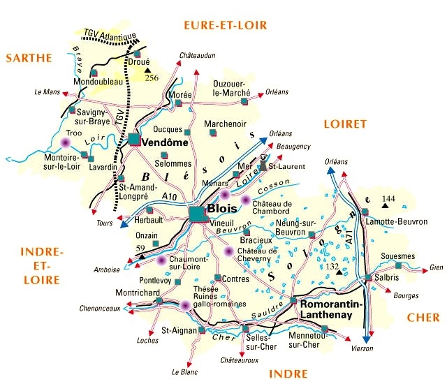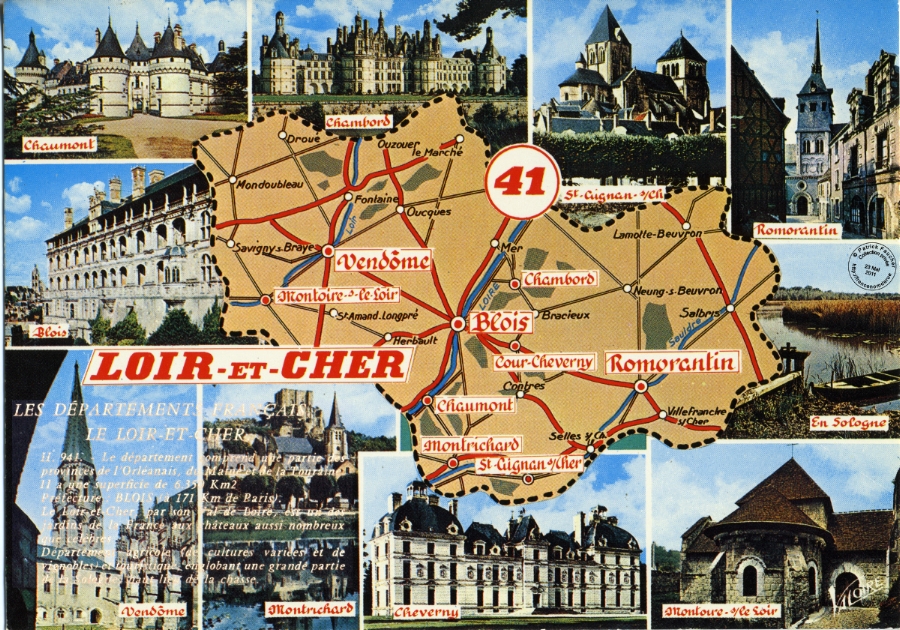 Le département : Le département du Loir-et-Cher est un département français situé dans la Région Centre. Son nom provient de deux rivières le traversant, le Loir au nord et le Cher au sud. Sa préfecture est Blois. La naissance du Loir-et-Cher en tant que département est laborieuse et difficile. Dans son rapport du 29 septembre 1789, le Comité de constitution avait prévu d’attribuer à la ville de Blois l’un des 80 départements. Mais se révèlent les prétentions des villes voisines, en premier lieu les chefs-lieux : Tours et Orléans. À l’intérieur même du département, Montrichard se tourne vers Amboise et Tours, Saint-Aignan veut se rattacher au Berry et Salbris à Vierzon. Finalement, Orléans abandonne à Blois une grande partie de la Sologne tout en conservant Beaugency, comme Tours refuse de céder Amboise. Le département est créé, le 4 mars 1790 en application de la loi du 22 décembre 1789, à partir d'une partie des anciennes provinces de l'Orléanais et de la Touraine, ainsi qu'une parcelle du Berry (rive gauche du Cher de Selles en Berry devenue Selles-sur-Cher à Saint-Aignan). Ces vicissitudes expliquent l’étranglement du département en son milieu et l’étirement maximum de sa surface au-delà du Loir au Nord et du Cher au Sud. La carte du département :![]() La carte postale du département :