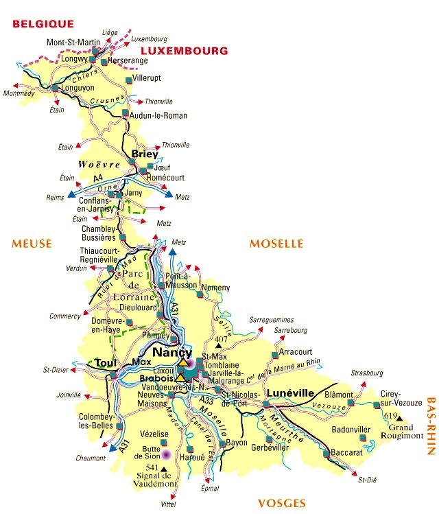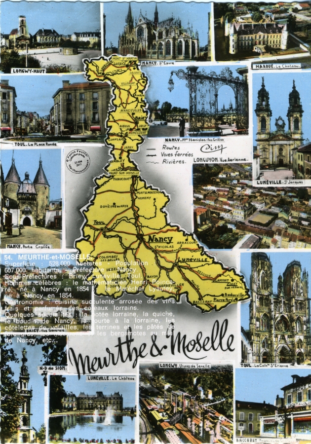 Le département : La Meurthe-et-Moselle est un département français de Lorraine dont la préfecture est Nancy, il est situé au centre de la région Lorraine et entouré par les départements de la Meuse, des Vosges, du Bas-Rhin et de la Moselle et sa frontière nord jouxte le Luxembourg et la Belgique. Le département de Meurthe-et-Moselle fut créé le 7 septembre 1871, à partir des territoires des départements de la Meurthe et de la Moselle que le traité de Francfort avait laissés à la France. Le département doit son nom aux deux principaux cours d'eau qui le traversent : la Moselle et la Meurthe. Parmi les autres rivières: la Chiers, la Seille et la Vezouze. Le relief est modelé par les vastes plaines que ces cours d'eau ont creusé dans le plateau lorrain. Il cède sa place au massif des Vosges au sud-est. Le point culminant est le Roc de Taurupt (731m), entre Bionville et Raon-sur-Plaine, un autre relief historiquement important est la colline de Sion. Le point le plus bas est situé à Arnaville (171 m). La carte du département :![]() La carte postale du département :
