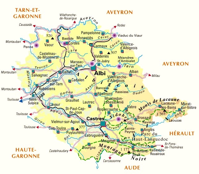 Le département : Le Tarn est un département français traversé par la rivière du même nom. Le Tarn est une rivière du sud de la France, la longueur de son cours est de 380,6 km. Il est, avec le Lot, l'un des principaux affluents de la Garonne, il a donné son nom aux départements français du Tarn et du Tarn-et-Garonne. Il se situe dans le Massif central. Il prend sa source sur le mont Lozère, dans la Lozère, et se jette dans la Garonne près de Castelsarrasin, sur la commune de Saint Nicolas de la Grave dans le Tarn-et-Garonne. Le département a été créé à la Révolution française, le 4 mars 1790 en application de la loi du 22 décembre 1789, à partir d'une partie de la province du Languedoc. Le département a été constitué à partir des diocèses d'Albi, Castres et Lavaur. Le Tarn fait partie de la région Midi-Pyrénées. Il est limitrophe des départements de l'Aveyron, de l'Hérault, de l'Aude, de la Haute-Garonne et de Tarn-et-Garonne. La vallée du Tarn forme une plaine, le centre du département est vallonné et le sud est formé d'un massif rocheux : la Montagne Noire. ![]() Le blason du département : ![]() Pour en savoir plus sur le département : Pour plus d'informations officielles, vous pouvez consulter le site du Conseil Général du Tarn . Pour organiser vos visites culturelles, vous pouvez utilement consulter le site du Tourisme dans le Tarn . Pour en savoir plus sur les communes traversées : Cliquez sur le lien suivant : Pour en savoir plus...